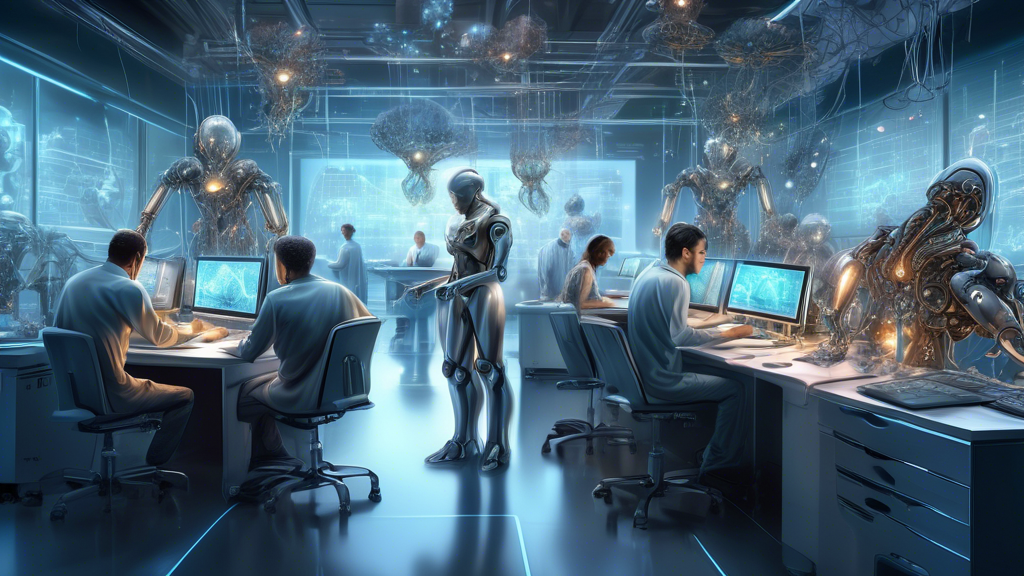 An imaginative digital painting depicting humans and robots collaboratively working on a futuristic AI project in a high-tech lab, showcasing computers with code, AI sketches, and 3D holograms of brain-like structures, symbolizing the blend of human creativity and machine precision.